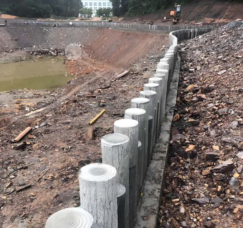 河道邊的土大多是淤泥、軟土,有的還夾雜石頭、樹(shù)根。施工前一定要用洛陽(yáng)鏟或探測儀查土質(zhì),比如淤泥層有多厚、下面有沒(méi)有硬土層。要是淤泥太厚,直接打樁容易 “打空”,樁會(huì )往下陷,這時(shí)候就得先清淤,或者用碎石墊一層 “打底”;要是有石頭、樹(shù)根,不清理掉會(huì )把樁頂裂,還會(huì )讓樁打不直。水泥仿木樁施工隊泓樺錦嘉去年在蘇州某河道施工,清出了不少樹(shù)根,要是沒(méi)清,至少一半的樁得廢。3. 算好樁的規格:別用 “小身板” 扛大壓力